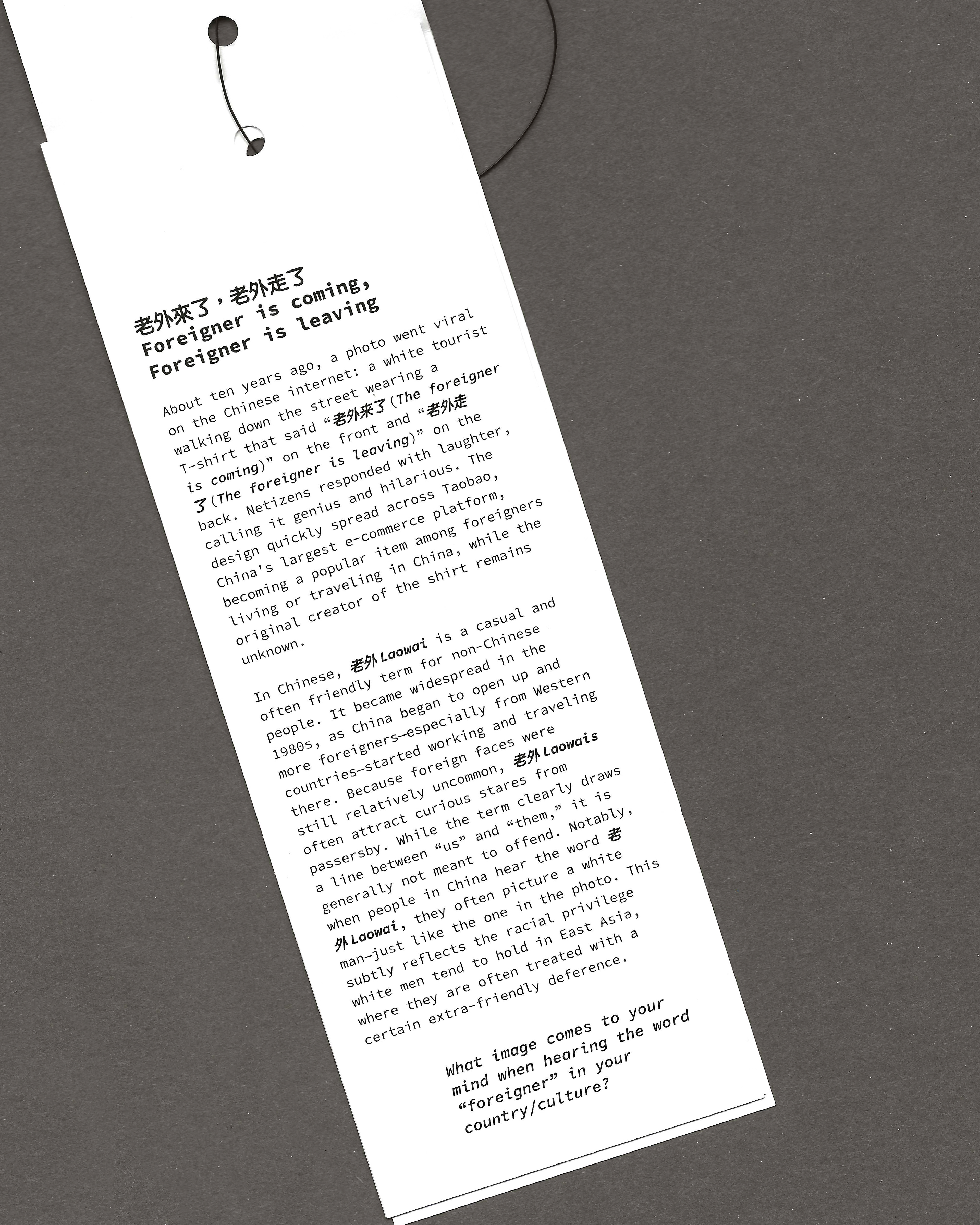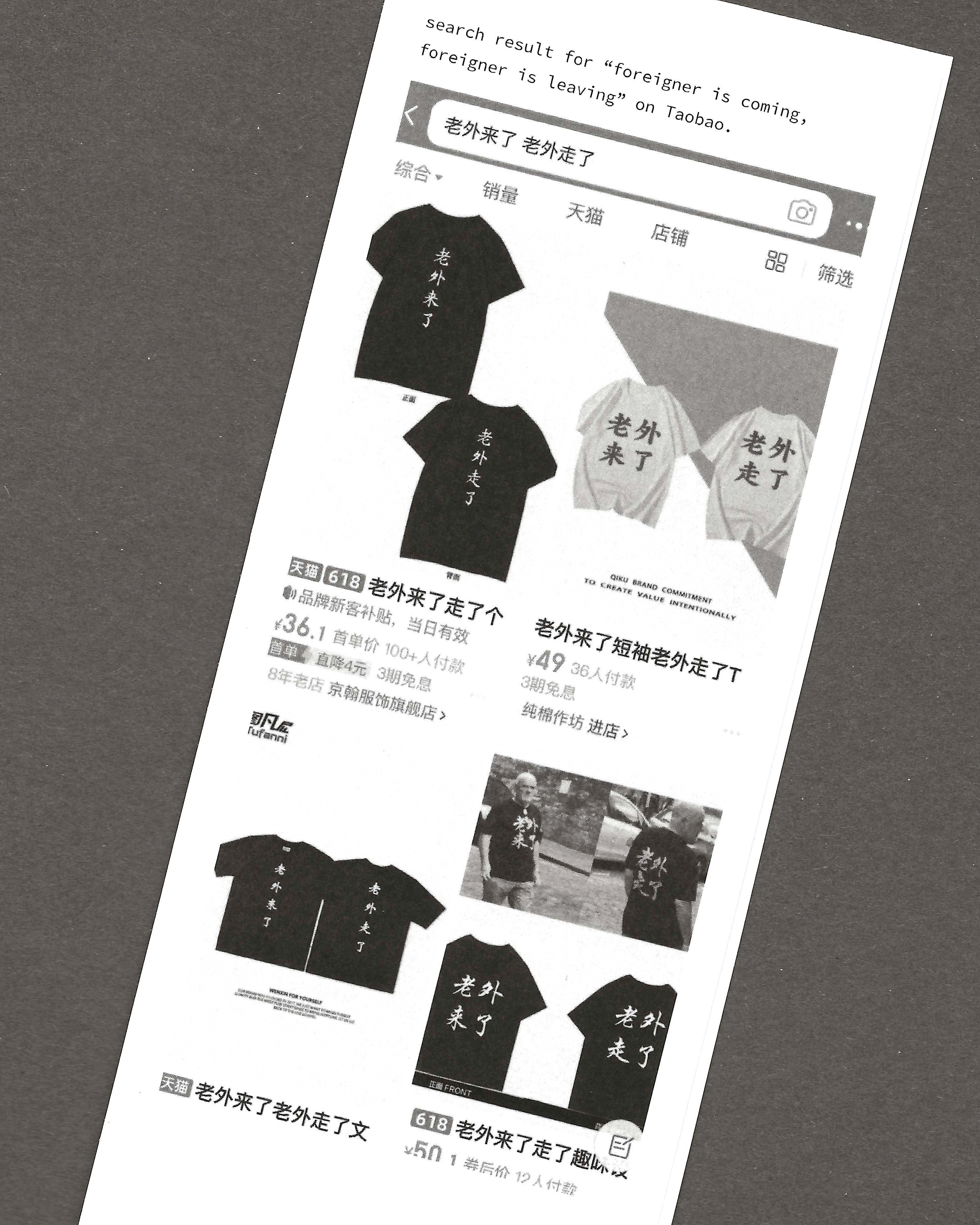 About ten years ago, a photo went viral on the Chinese internet: a white tourist walking down the street wearing a T-shirt that said “老外来了 (The foreigner is coming)” on the front and “老外走了 (The foreigner is leaving)” on the back. Netizens responded with laughter, calling it genius and hilarious. The design quickly spread across Taobao, China’s largest e-commerce platform, becoming a popular item among foreigners living or traveling in China, while the original creator of the shirt remains unknown.