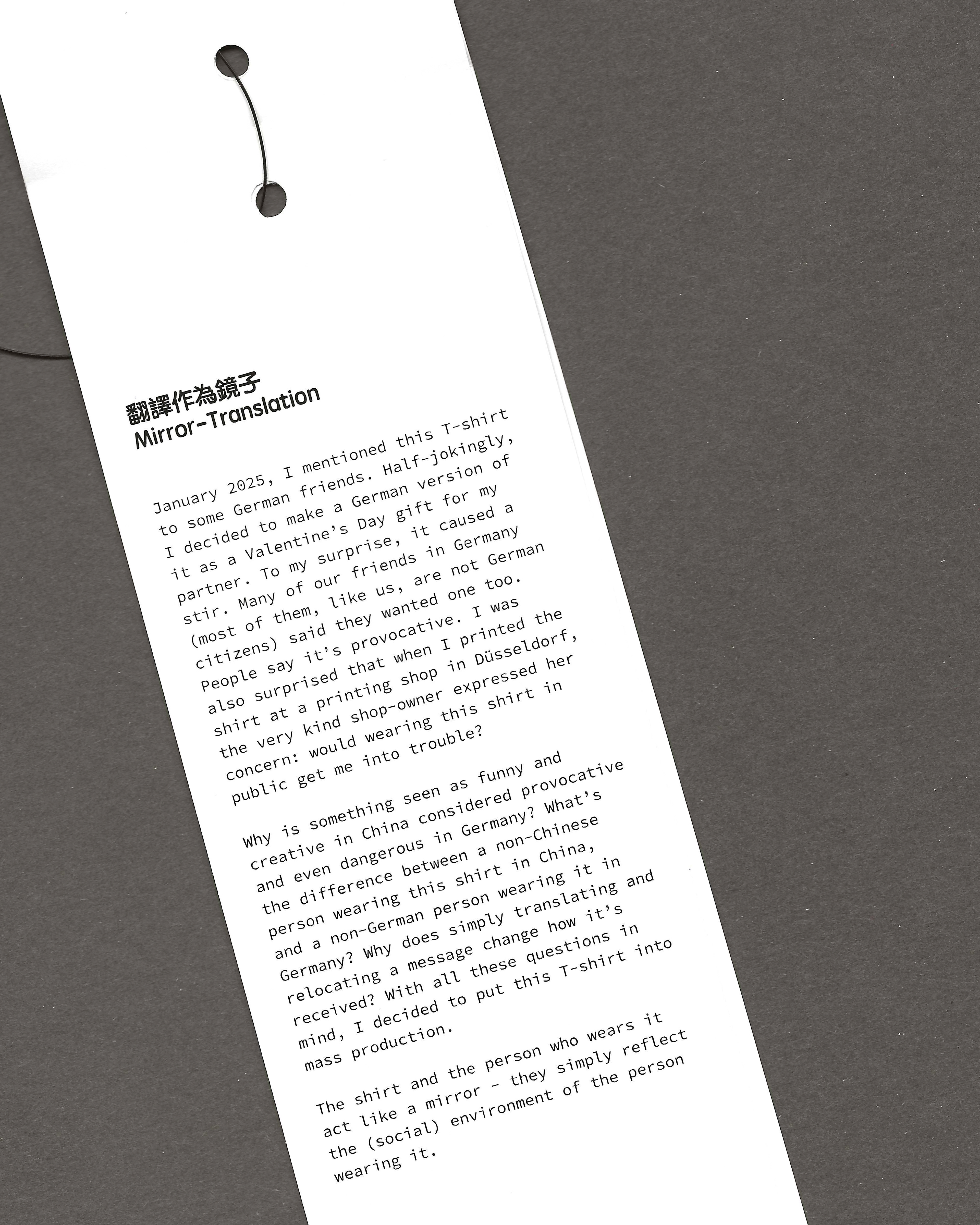 Why is something seen as funny and creative in China considered provocative and even dangerous in Germany? What’s the difference between a non-Chinese person wearing this shirt in China, and a non-German person wearing it in Germany? Why does simply translating and relocating a message change how it’s received? With all these questions in mind, I decided to put this T-shirt into mass production.